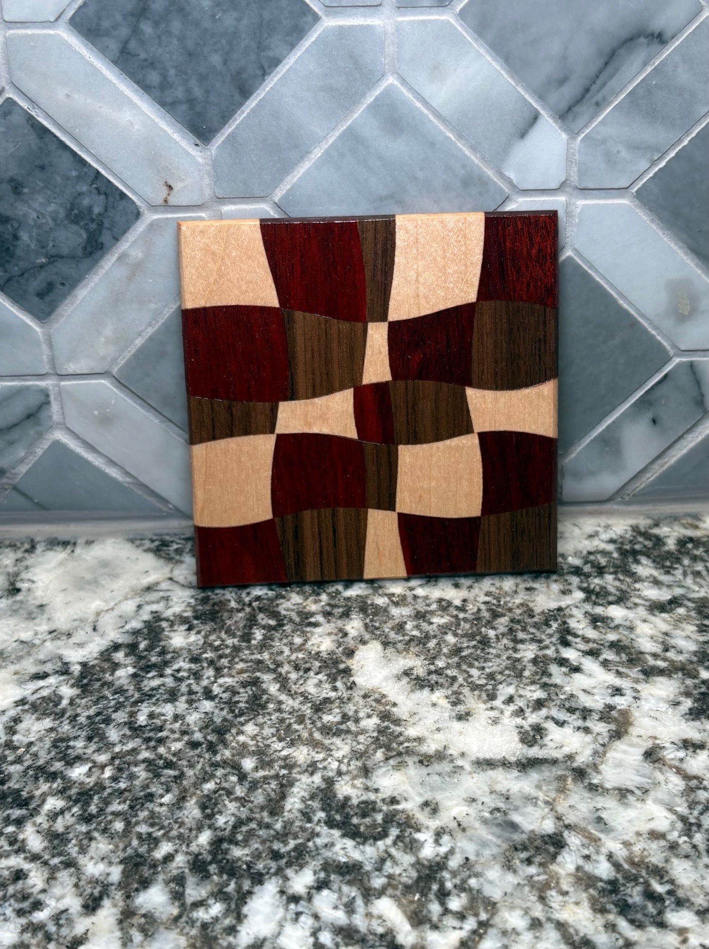 This coaster is a drunken checkerboard coaster, using Maple, Blood Wood, and Walnut.