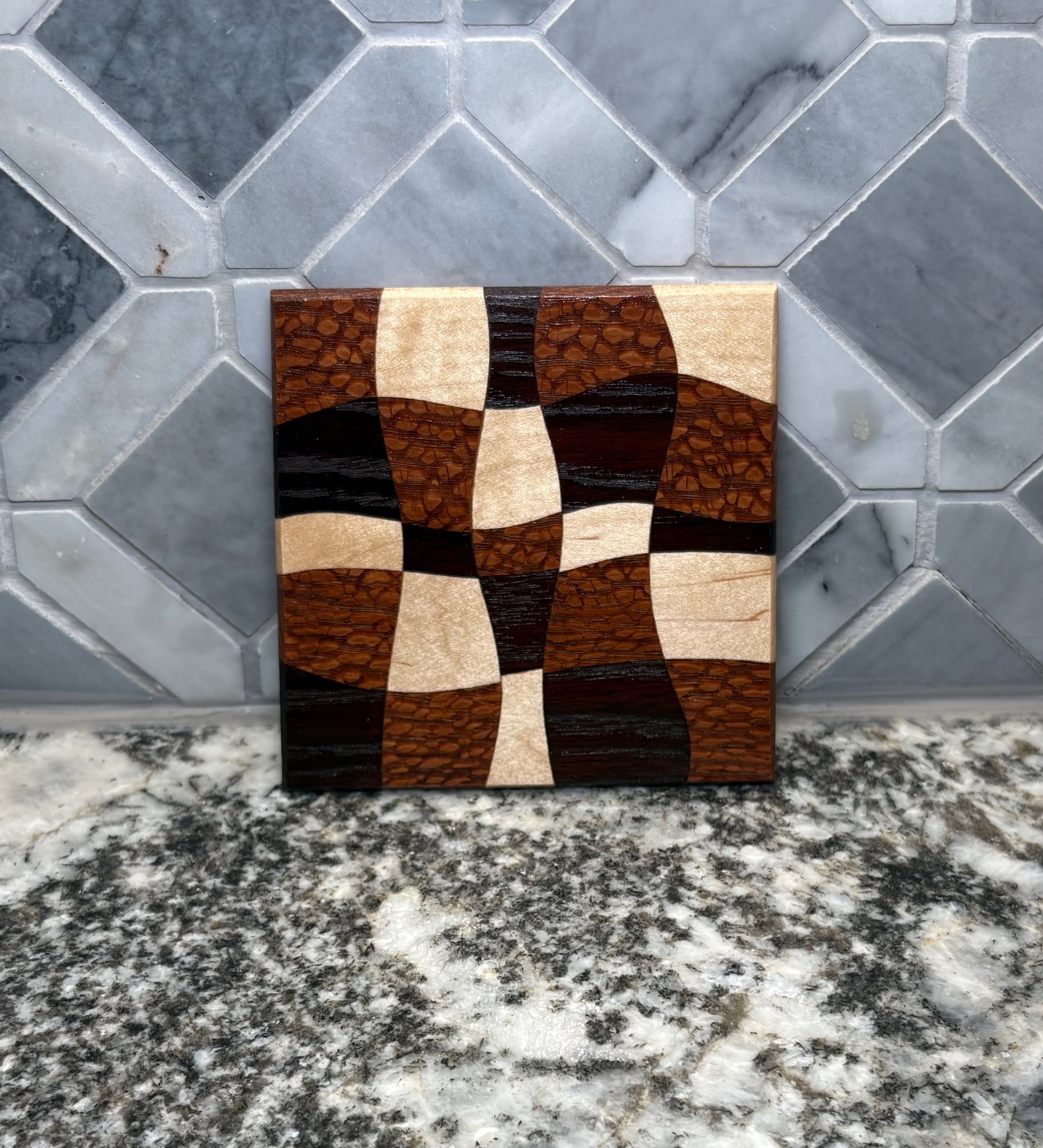 This coaster is a  drunken checkerboard coaster, using Maple, Leopard Wood, and Roasted ash.