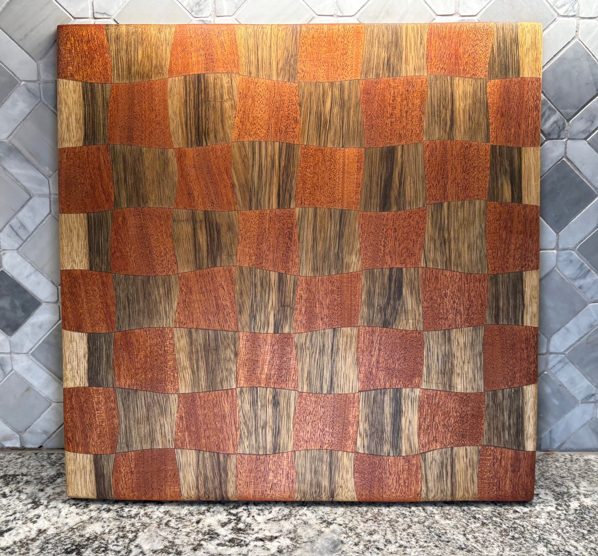 Give game night and entertaining a stylish twist with this handcrafted Drunken Checkerboard. Measuring approximately 15½” x 15½” x 5/8″, the board features large ~2″ squares arranged in an eye-catching “drunken” or wavy pattern that reads perfectly as a chessboard or checkerboard. Built from solid Mahogany and Black Limba, the contrasting woods create warm, natural tones and a durable playing surface that also doubles beautifully as a cutting board or charcuterie presentation piece.