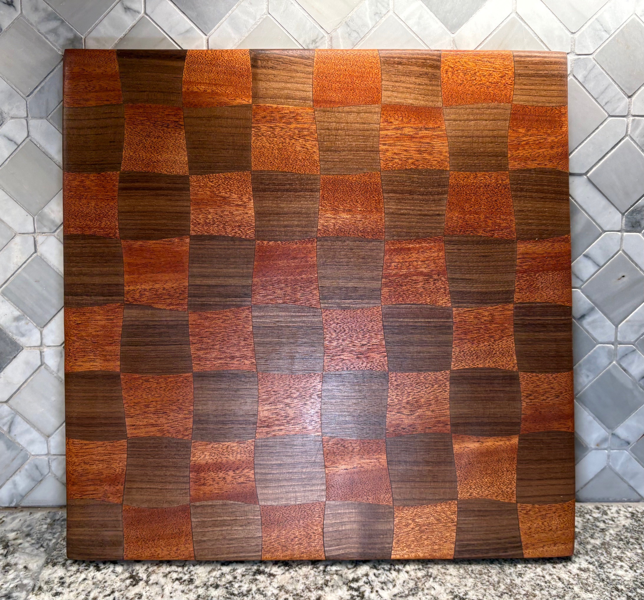 A playful 15½” x 15½” drunken checkerboard made from rich Walnut and vibrant Bloodwood — 2″ wavy squares serve as a chess/checker board or a sturdy cutting/charcuterie board (5/8″ thick).