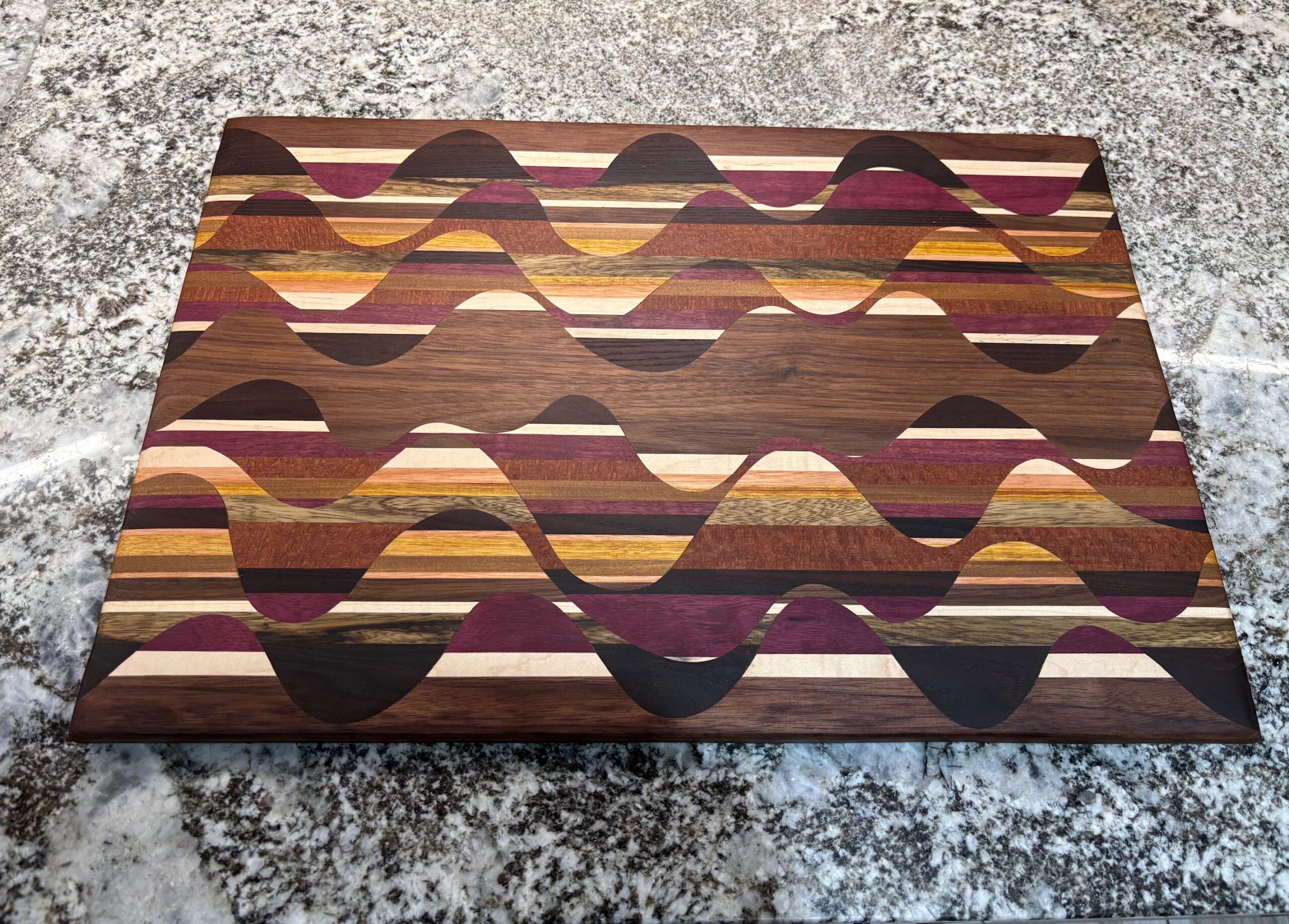 This particular board is made with Roasted Ash, Maple, Canary Wood, Leopard Wood, Walnut, Black Limba and Red Grandis.