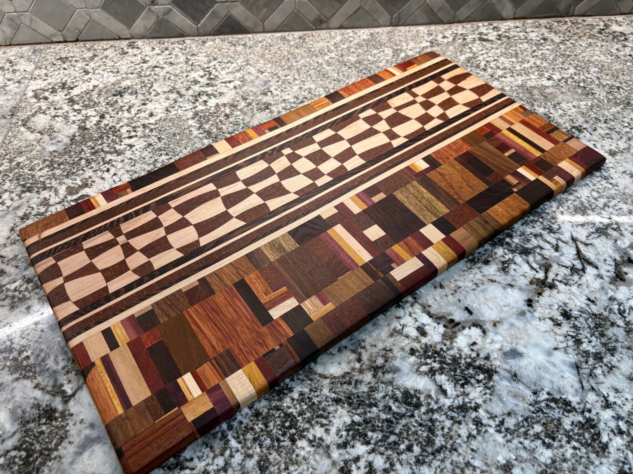 This particular board was made with randomized wood pieces and a drunken checkerboard ribbon made out of Leopard Wood, Maple and Wenge.