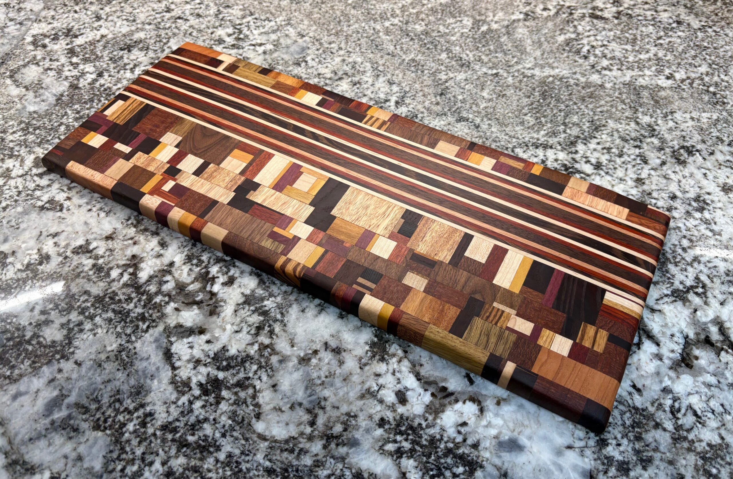 This particular board is made with randomized wood pieces and a ribbon made out of Maple, Blood Wood, Red Grandis, Walnut and Wenge.