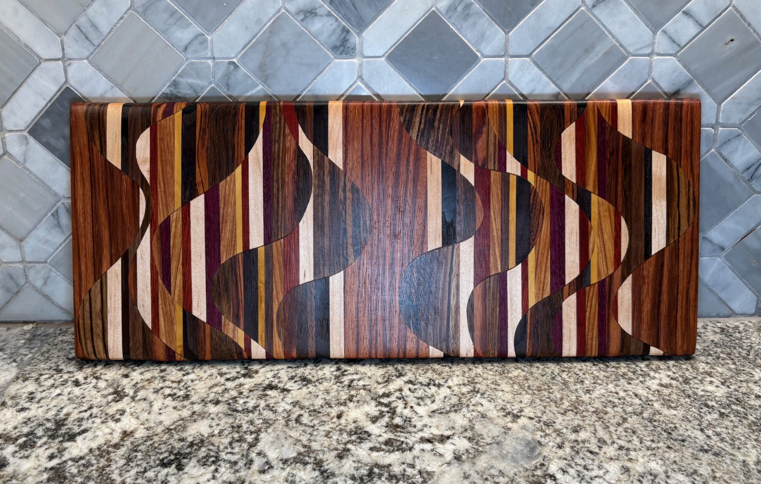 This particular board is made with, Roasted Ash, Maple, Poluli, Walnut, Yellow Heart, Blood Wood, Canary Wood, Leopard Wood , Shedua and Goncalo Alves.