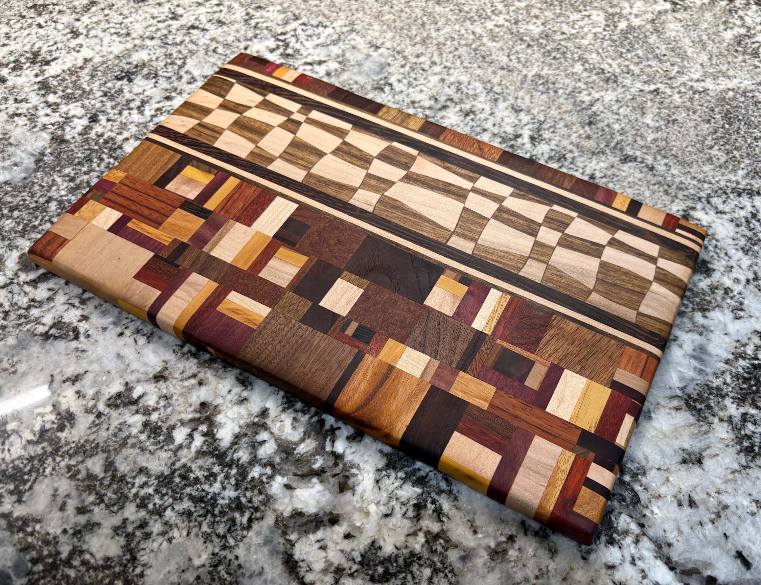 This particular board is made with randomized wood pieces and a drunken checkerboard ribbon made out of Shedua and Maple.