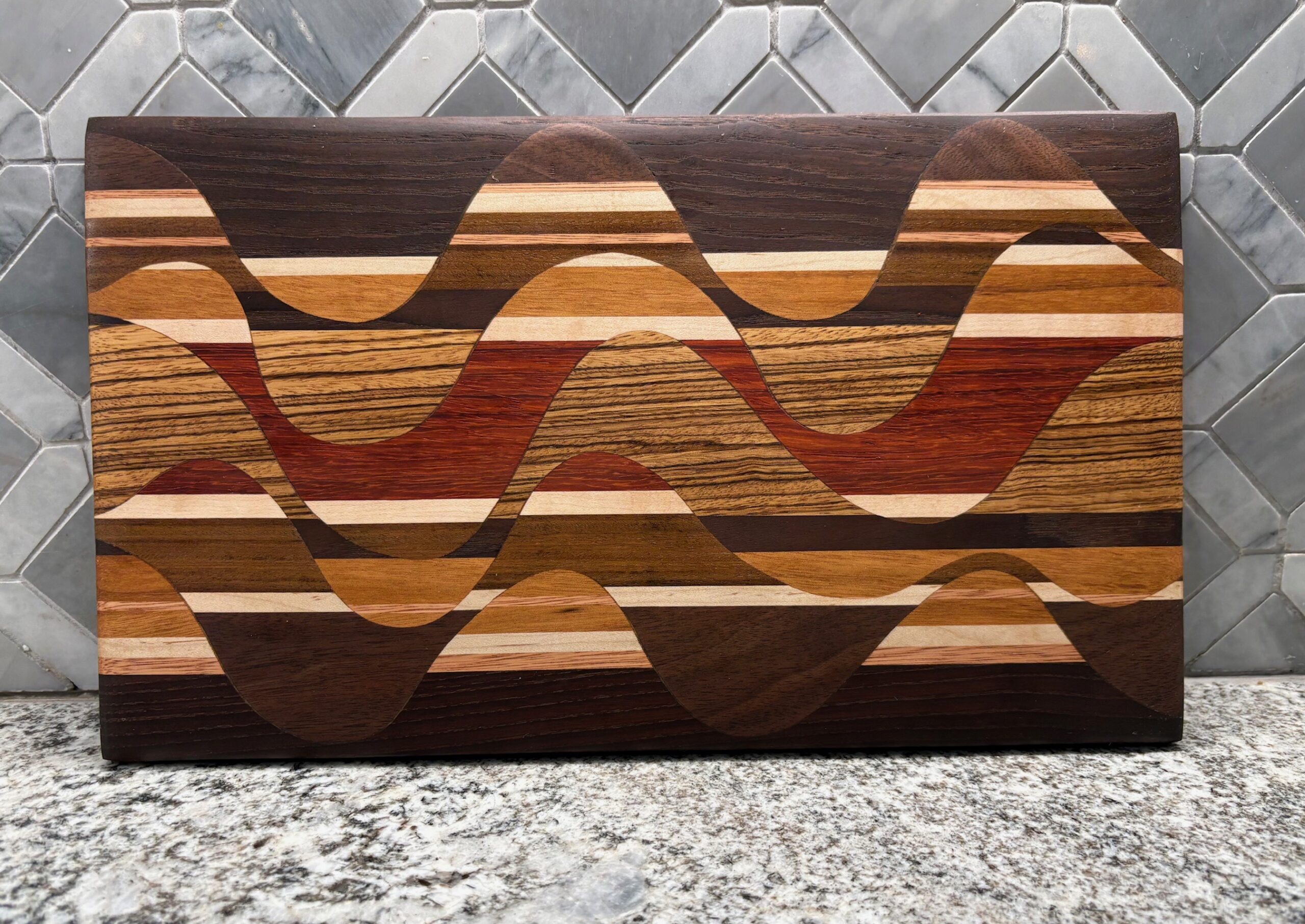 This particular board is made with Walnut, Roasted Ash, Maple, Red Grandis, Blood Wood, Goncalo Alves and Zebra Wood.
