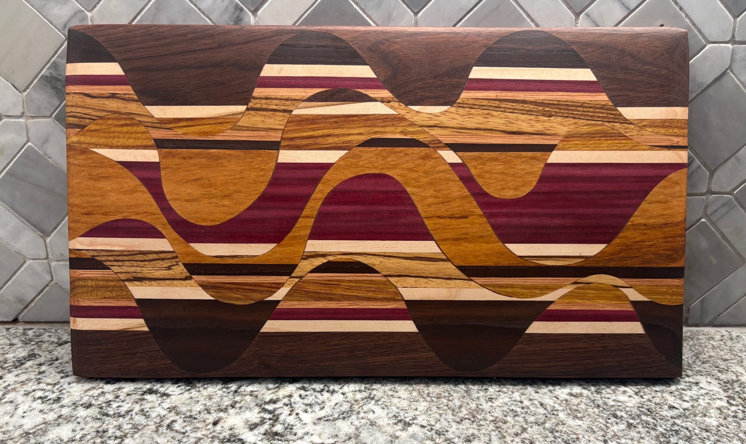 This particular board is made with Walnut, Roasted Ash, Canary Wood, Maple, Red Grandis, Purple Heart, Goncalo Alves and Zebra Wood.