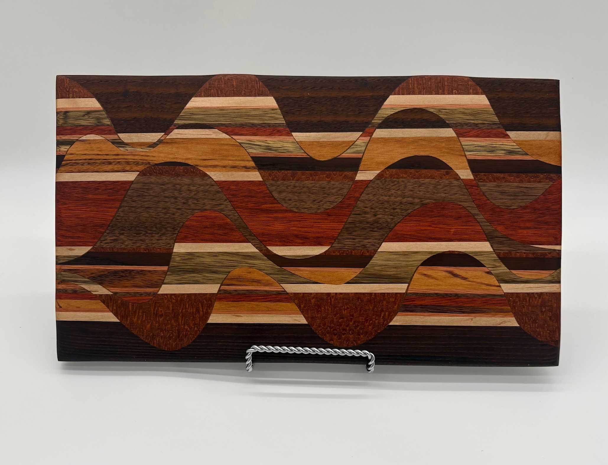 This particular board is made with Walnut, Roasted Ash,Maple, Red Grandis, Goncalo Alves, Black Limba, Leopard Wood and Blood Wood.