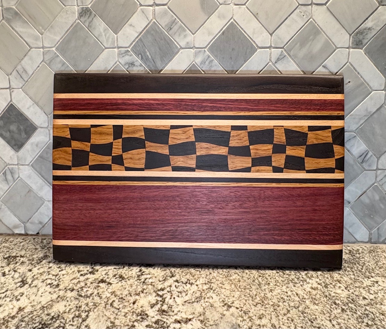 This particular board is made with A drunken checkerboard ribbon made out of Oak and Roasted Ash, The rest of the board is made out of Roasted Ash, Purple Heart, and Maple.